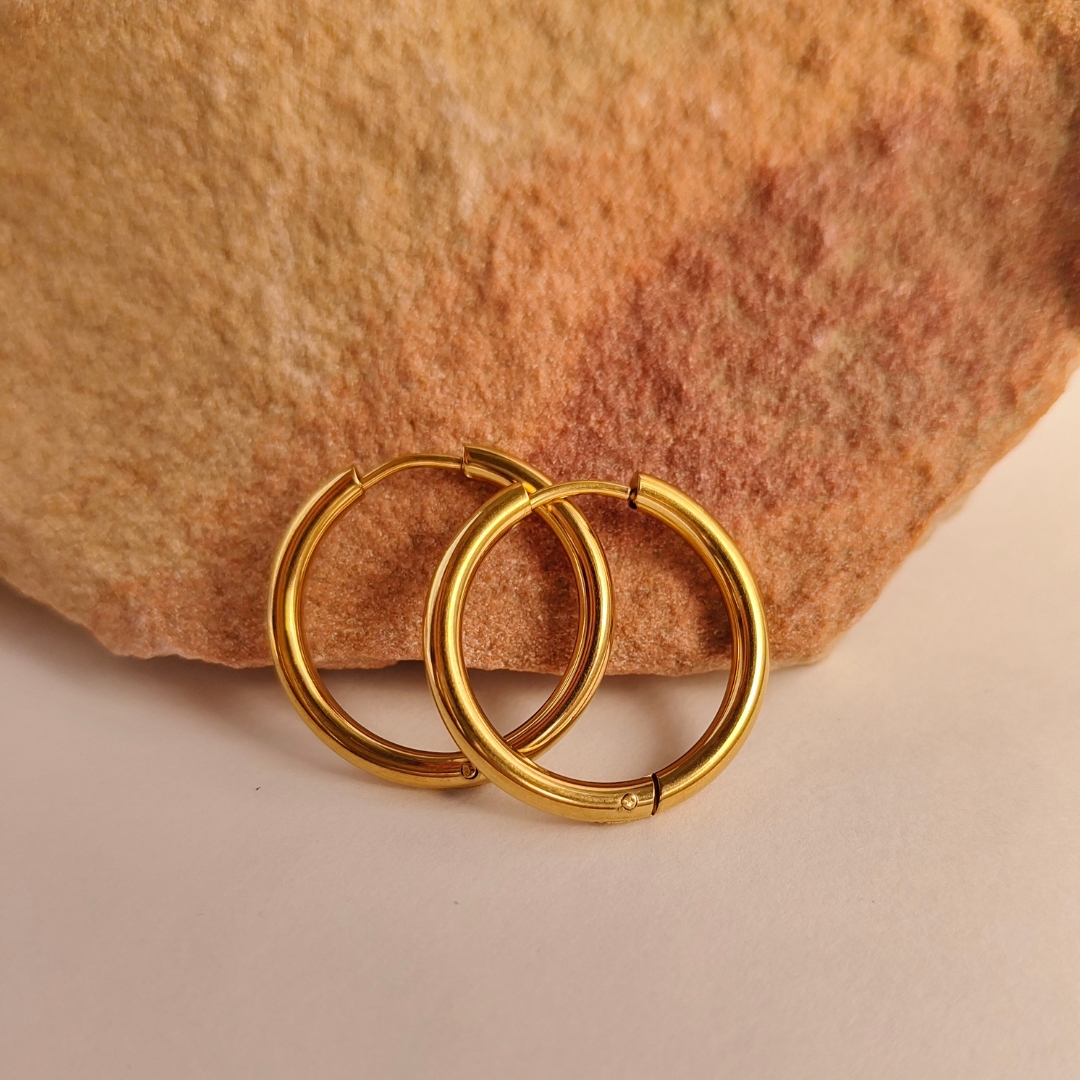 The Chic Gold Hoops are an essential addition to any jewelry collection. With a thin, mid-sized design and a gold-plated finish that resists tarnish, these hoops are both durable and elegant. Their sleek silhouette makes them versatile for any occasion, offering a touch of class that will last for years.