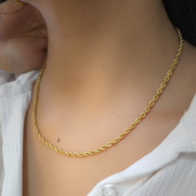 This gold-plated rope chain is a blend of classic charm and modern luxury. Its intricate weave adds a touch of bold sophistication, making it perfect for both layering and standalone wear. Crafted to be anti-tarnish and long-lasting, this chain embodies everyday elegance.