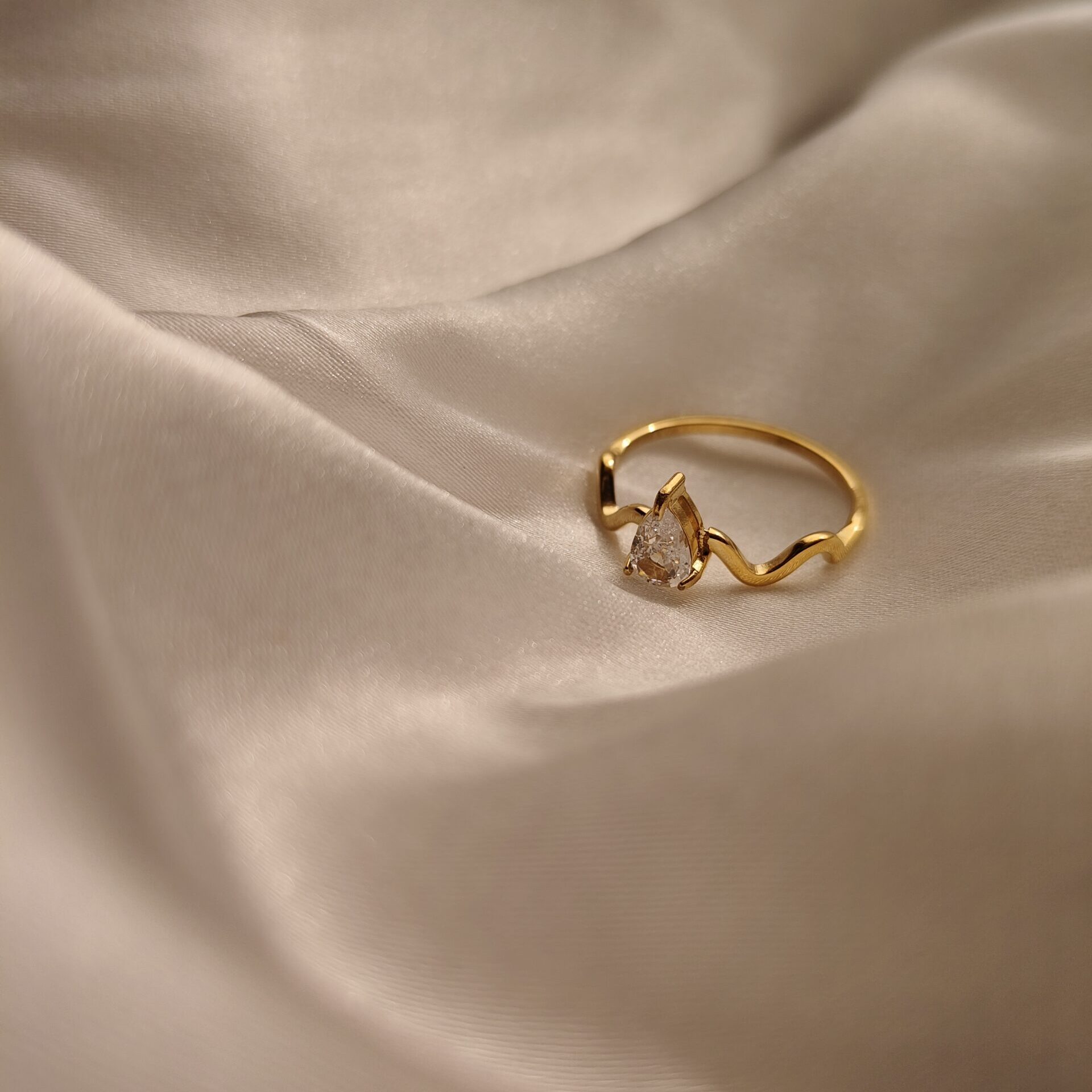 A graceful fusion of shimmer and simplicity. Crafted with a sleek gold band and crowned with a sparkling pear-cut stone, this ring evokes the quiet glow of dusk. Its subtle wave detail adds a modern touch, making it perfect for stacking or wearing solo as a refined statement.
