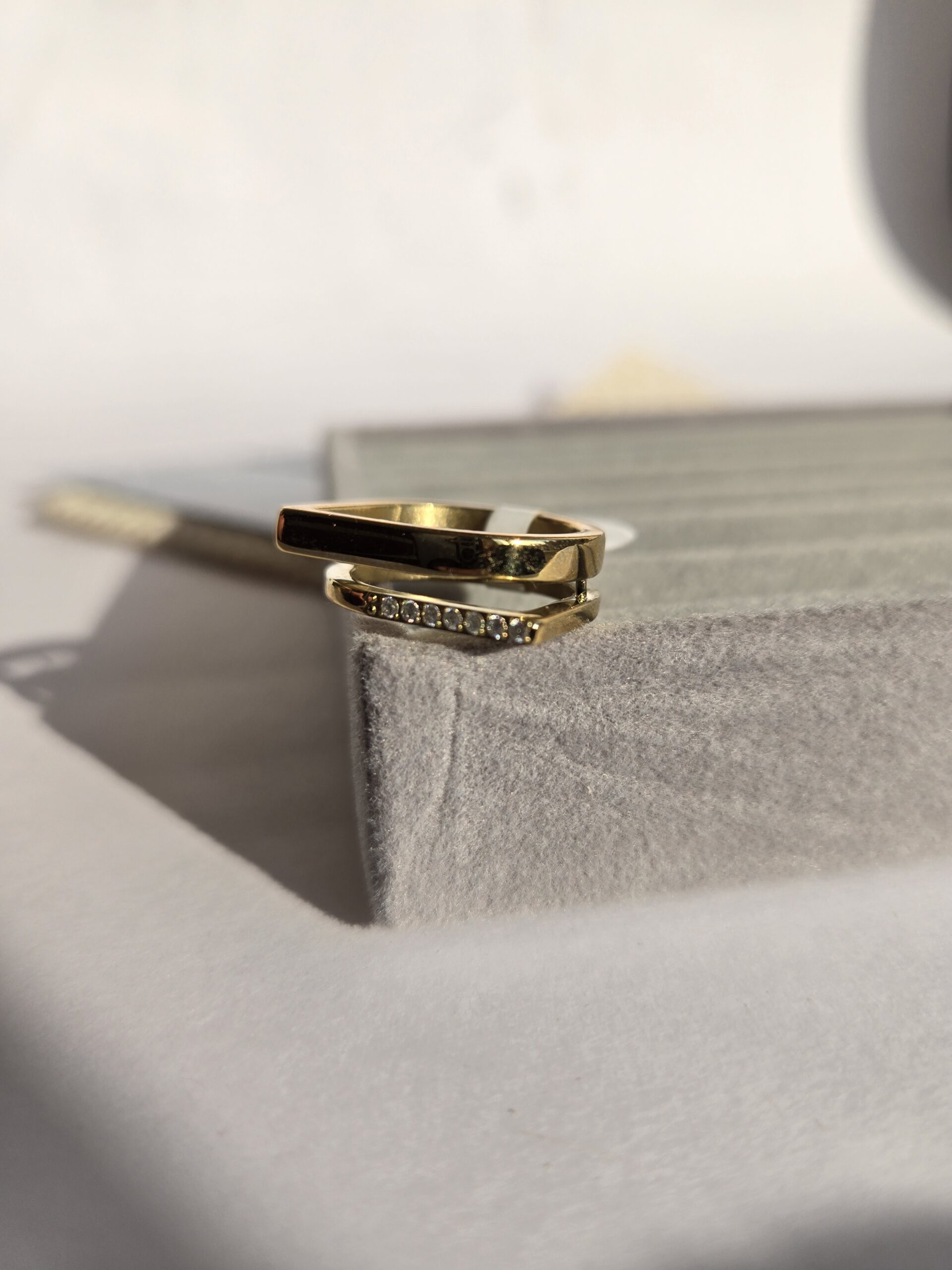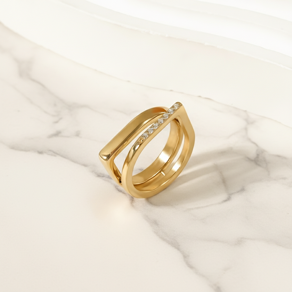 A contemporary gold-plated ring defined by clean geometric lines and subtle crystal detailing. Designed for effortless everyday wear with a refined, modern finish.