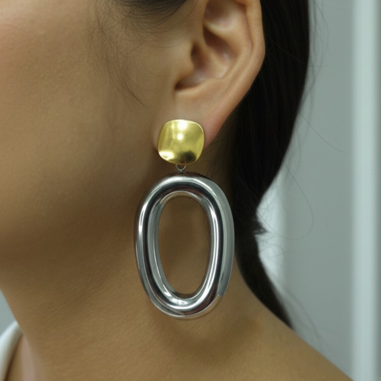 A statement of contrast and balance, these dual-tone oval earrings fuse silver and gold hues for a chic, modern look. Designed to complement any outfit, they radiate contemporary luxury.