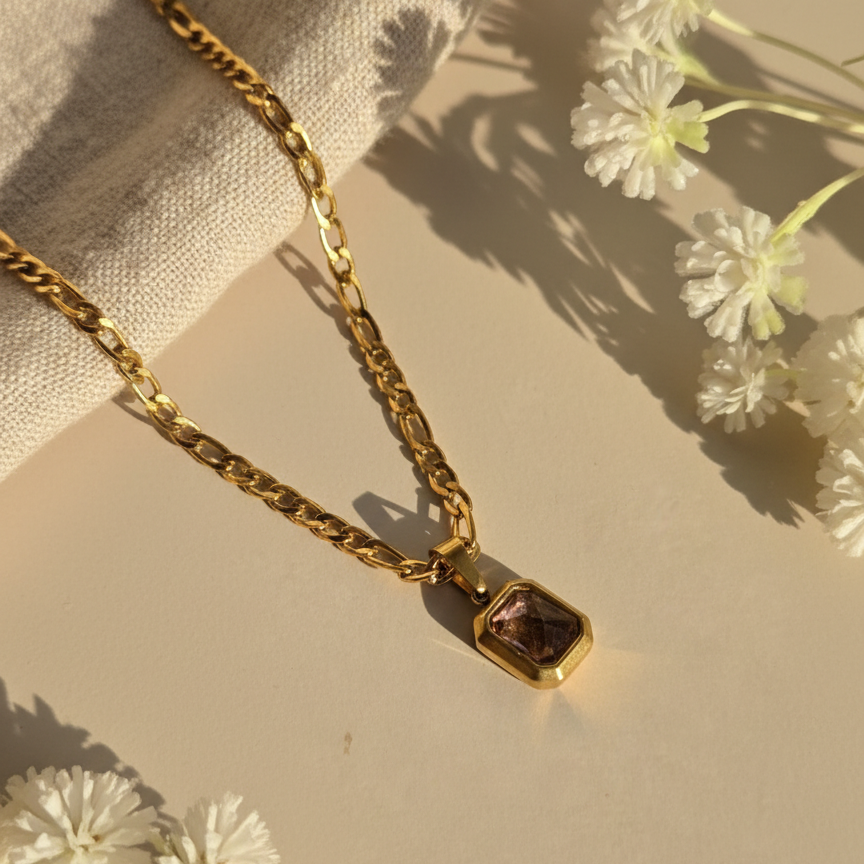 Features a sleek geometric stone pendant with a polished gold-tone finish