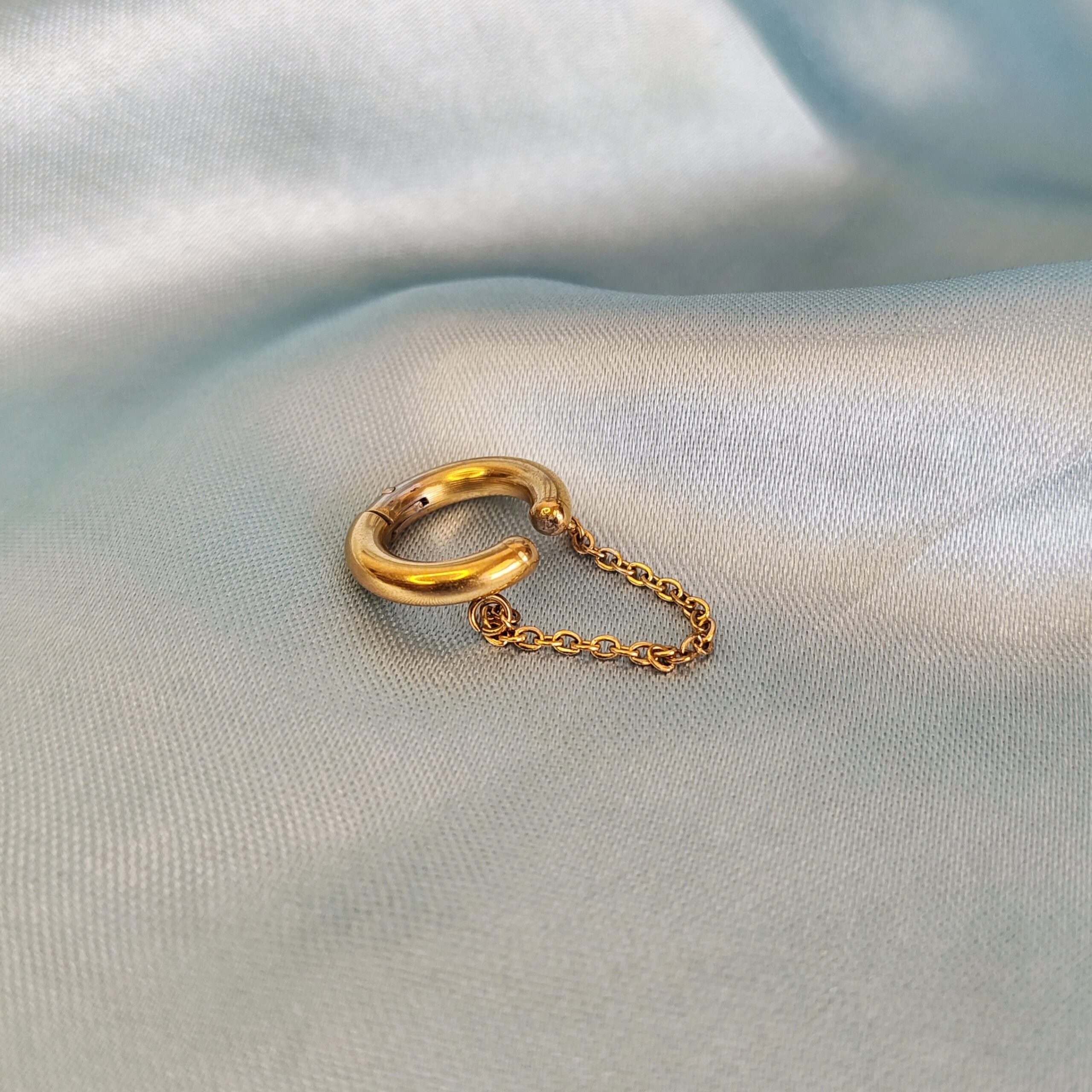 Trendy gold-plated ear cuff featuring a delicate dangling chain for a chic, edgy look