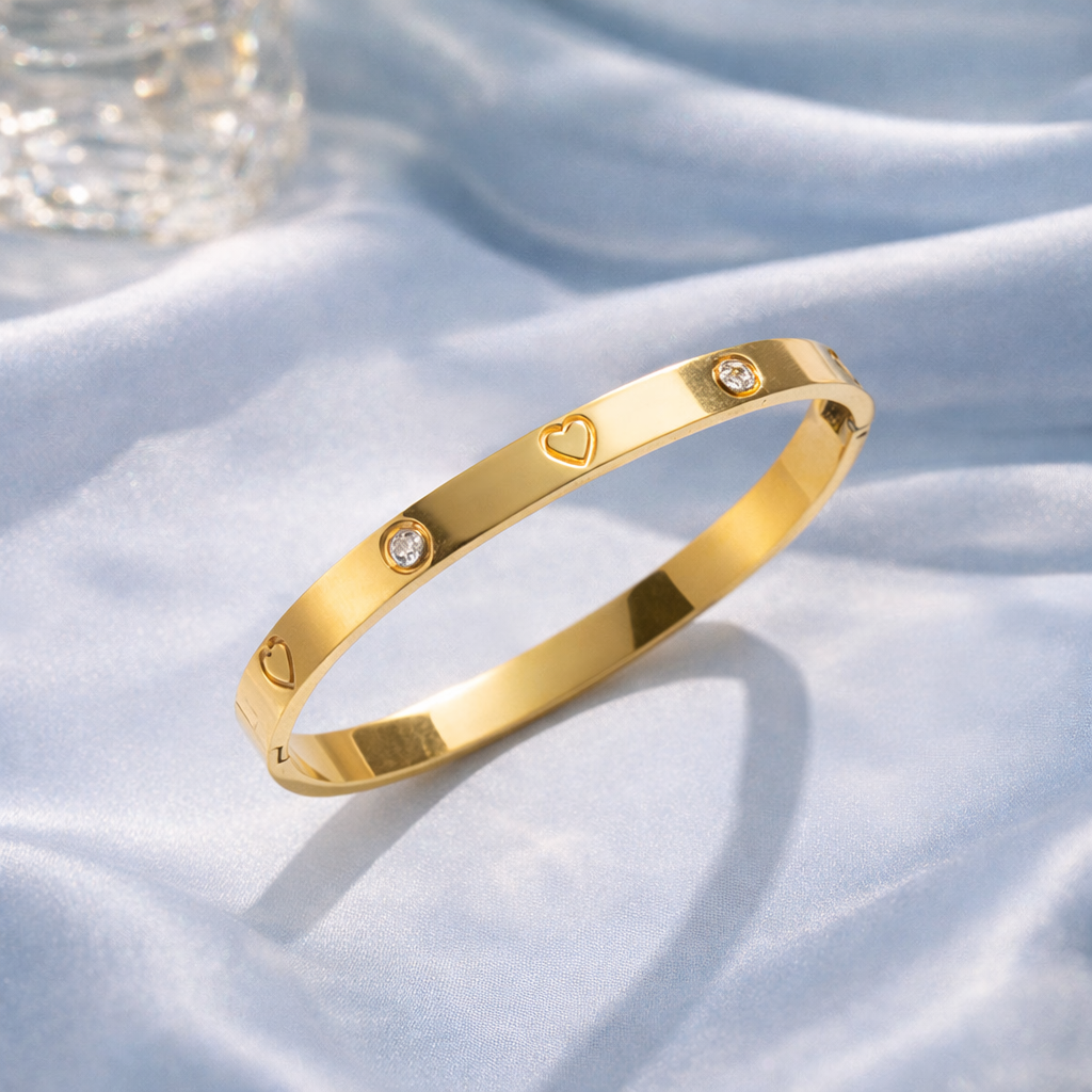 A refined gold-plated bangle featuring delicate heart engravings and subtle crystal detailing.