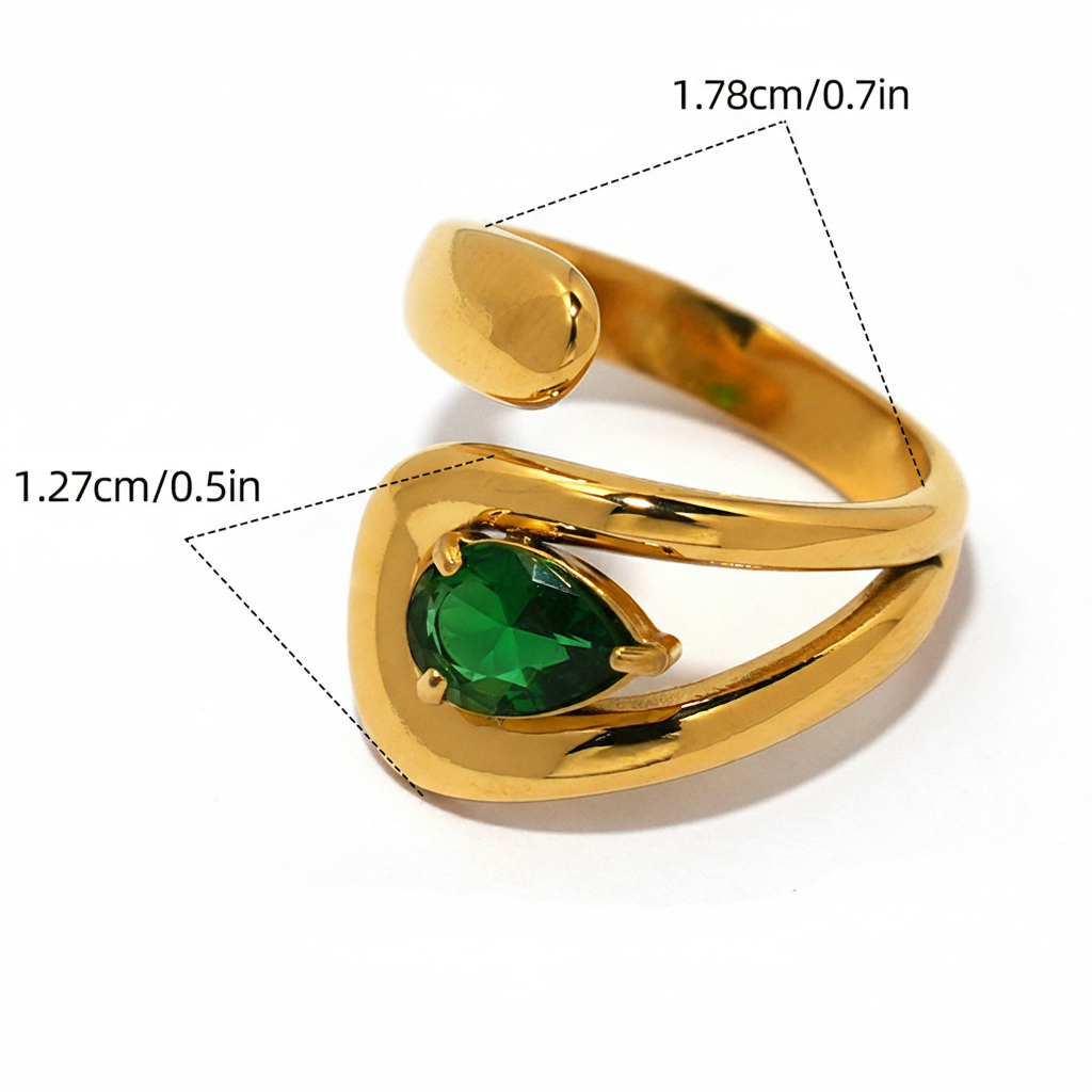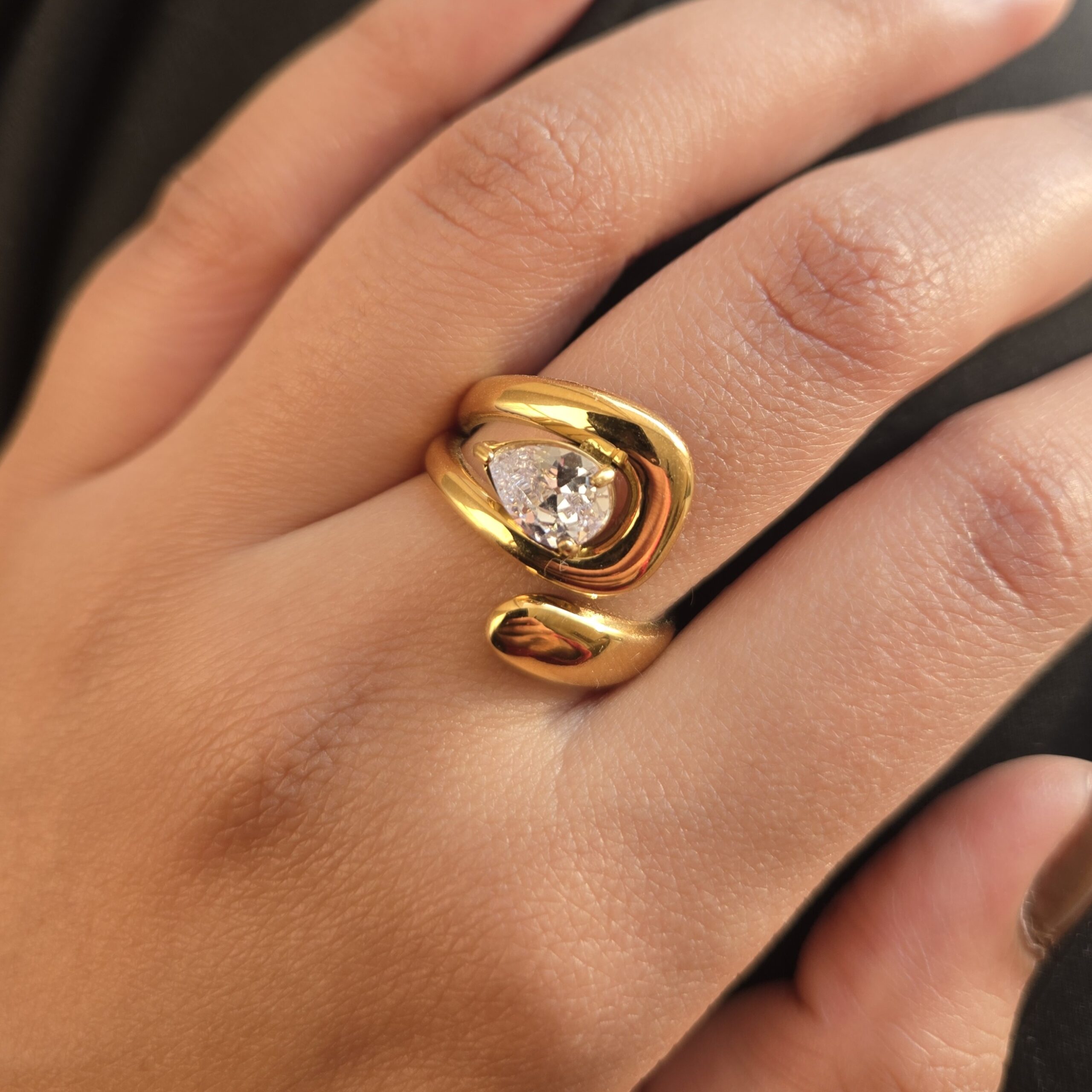 A sculptural gold-plated ring featuring a luminous pear-cut crystal in a fluid open design. Elegant, adjustable, and crafted for everyday statement styling.