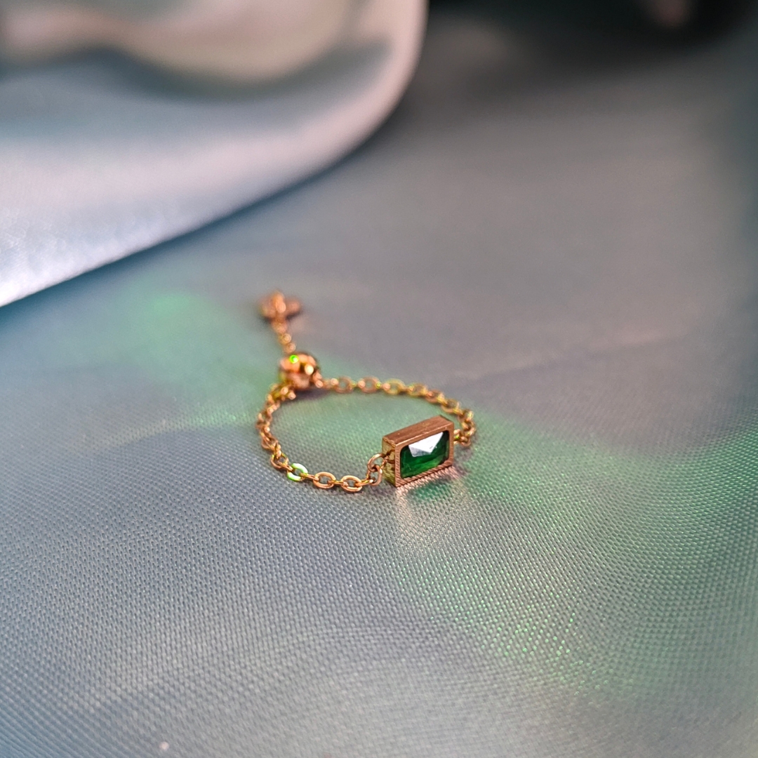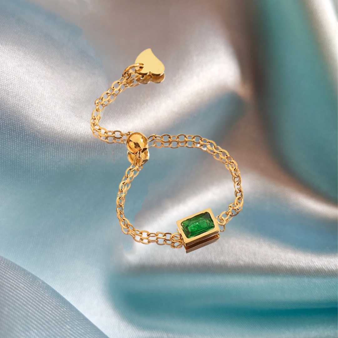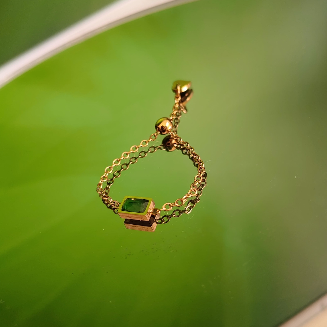 This is a delicate adjustable chain ring that combines elegance with versatility. Featuring a framed green stone at its center, this ring offers a add of color and a modern, minimalist design. The adjustable chain ensures a comfortable fit, making it perfect for everyday wear or as a unique statement piece. With its high-quality, anti-tarnish gold-plated finish, this ring is crafted to stay radiant for years to come.